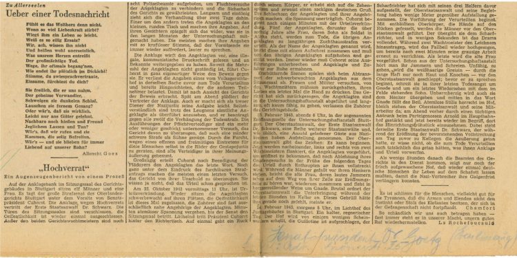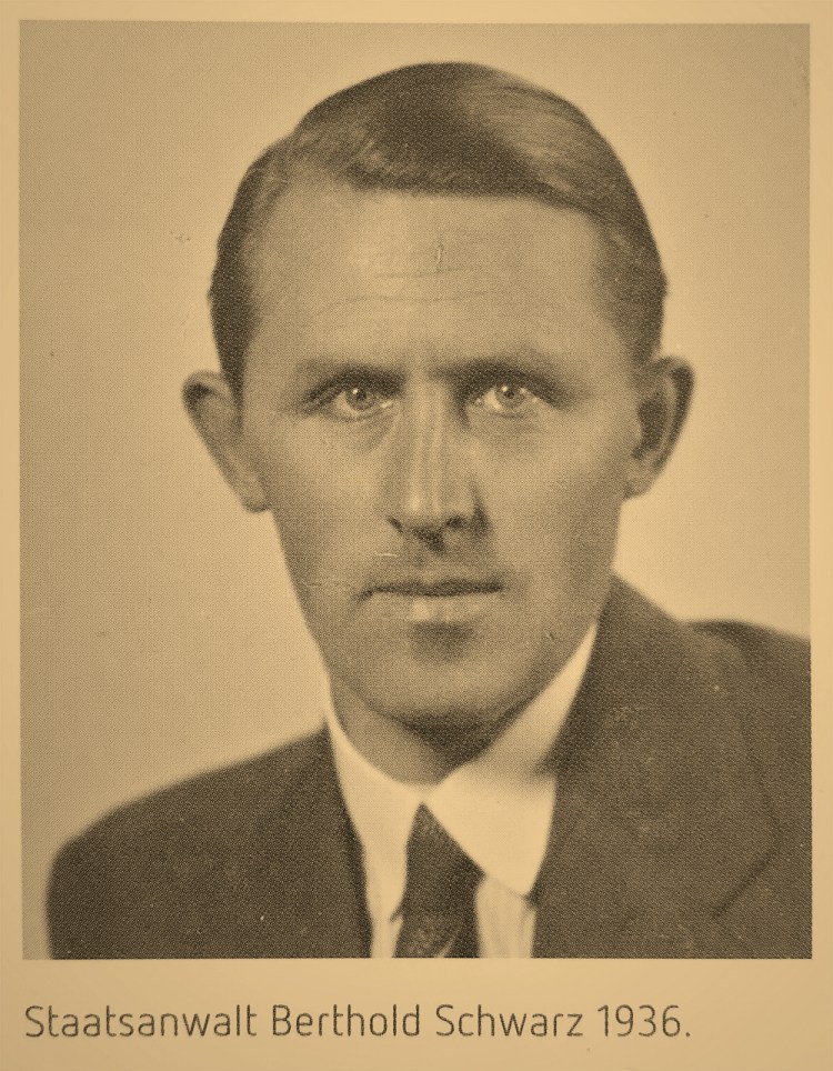 Der Vater meines Vaters und Sohn eines lutherischen Pfarrers (!), Dr. Berthold Schwarz, war politischer Staatsanwalt am grausamen Sondergericht Stuttgart. An manchen Tagen vollzog man hier mehr als 20 Todesurteile. Erbarmungslos wurden die Häftlinge mit der Guillotine hingerichtet. Der Hochverrats-Prozess des Jahres 1942, den mein Grossvater als berühmt-berüchtigter Staatsanwalt gegen eine Widerstandsgruppe führte, war nur einer unter vielen in seiner Laufbahn als Nazi-Jurist. Gewohnheitsgemäss und furchterregend begann er seine Reden mit den Worten: „Der Volksgerichtshof hat ein schönes Wort geschaffen: Wer gegen den Staat ist, wird vom Staat vernichtet werden.“ – und beantragte kurz darauf gegen alle zwölf Angeklagten die Todesstrafe. Fünf von ihnen wurden am frühen Morgen des 24. Februar 1943 – zum Genuss meines Grossvaters – im Lichthof des Justizgebäudes mit dem Fallbeil hingerichtet. Um von den Ermordeten jegliche Spur auszulöschen, wurden ihre sterblichen Überreste „als unbekannte Verbrecher“ deklariert und der Heidelberger Anatomie übergeben. Diese letzte an ihnen vollzogene Schandtat wurde durch einen unvorhergesehenen Zufall aufgedeckt. Ein Arzt erkannte mit Entsetzen beim Sezieren einer Leiche einen der Hingerichteten, seinen früheren Schulkameraden.