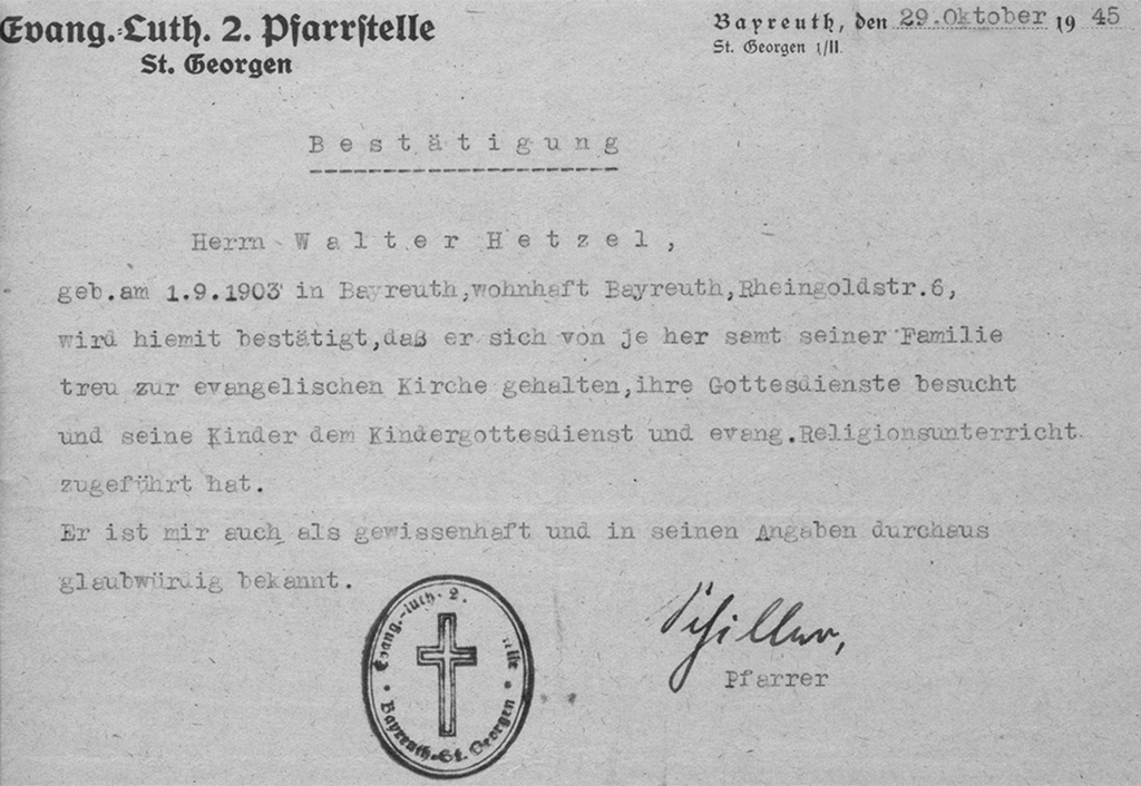 Der Vater meiner Mutter, Walter Hetzel, war ein überzeugter Nazi, Mitglied in der NSDAP und der SA und natürlich bekannter Kirchenvorstand der Ordenskirche in Bayreuth. Ende des Krieges wurde die Familie als treues Mitglied der Kirchengemeinde St. Georgen durch den ‘Persilschein’ ihres Pfarrers ‘reingewaschen’.